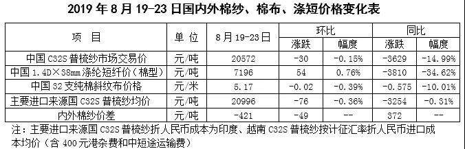 本周,國內(nèi)外棉價(jià)繼續(xù)下跌;國內(nèi)外棉紗價(jià)格持續(xù)走低;滌綸短纖價(jià)格止跌上漲。