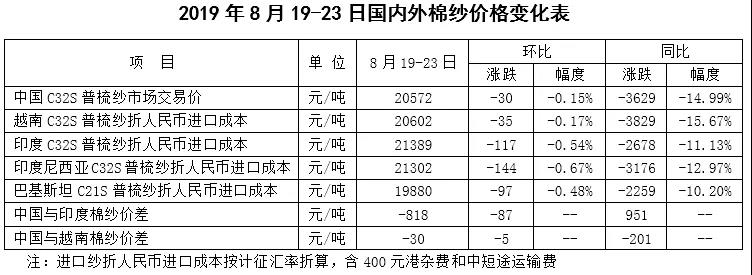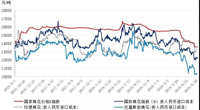本周,隨著美國對中國商品加征關(guān)稅,中方提出反制措施,市場悲觀情緒加重,國內(nèi)棉價(jià)繼續(xù)下跌。2019年8月19-23日,代表內(nèi)地標(biāo)準(zhǔn)級(jí)皮棉銷售價(jià)格的國家棉花價(jià)格B指數(shù)13544元/噸,較上周下跌26元/噸,跌幅0.19%;鄭州棉花期貨主力合約結(jié)算均價(jià)12803元/噸,較上周下跌19元/噸,跌幅0.15%;儲(chǔ)備棉輪出成交均價(jià)11870元/噸,較上周下跌90元/噸,跌幅0.75%。