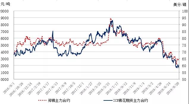本周,美棉出口數(shù)據(jù)疲弱疊加中美貿(mào)易形勢緊張加劇市場對棉花需求的擔(dān)憂,國際棉價(jià)繼續(xù)下跌。2019年8月19-23日,紐約棉花期貨主力合約結(jié)算價(jià)59.10美分/磅,較上周下跌0.4美分/磅,跌幅0.67%,代表進(jìn)口棉中國主港到岸均價(jià)的國際棉花指數(shù)(M)70.35美分/磅,較上周下跌0.03美分/磅,幅跌0.04%,折人民幣進(jìn)口成本12151元/噸,較上周下跌5元/噸,跌幅0.04%;內(nèi)外棉價(jià)差1365元/噸,較上周縮小49元/噸。