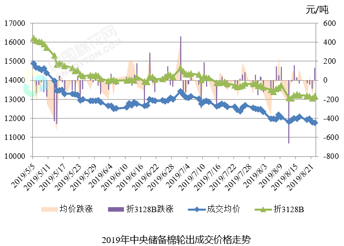 上周(2019年8月19-23日)是2019年中央儲(chǔ)備棉輪出第十六周,中國(guó)儲(chǔ)備棉管理有限公司掛牌銷售中央儲(chǔ)備棉5.70萬噸,其中新疆棉3.21萬噸,地產(chǎn)棉2.49萬噸。