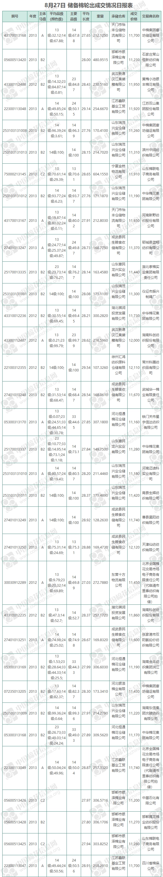 8月27日儲備棉輪出銷售資源11991.4233噸,實(shí)際成交8120.4929噸,成交率67.72%,成交均價(jià)11512元/噸,較26日下跌79元/噸;折3128價(jià)格12860元/噸,較26日上漲17元/噸。