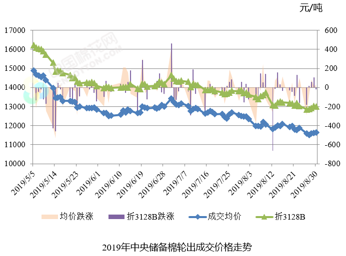 上周(2019年8月26-30日)是2019年中央儲(chǔ)備棉輪出第十七周,中國(guó)儲(chǔ)備棉管理有限公司掛牌銷售中央儲(chǔ)備棉5.80萬(wàn)噸,其中新疆棉3.27萬(wàn)噸,地產(chǎn)棉2.53萬(wàn)噸。
