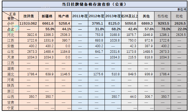 2.當(dāng)日輪出上市儲(chǔ)備棉中有部分為分批抽樣公檢。抽樣比率及抽樣方法按照棉花國(guó)家標(biāo)準(zhǔn)規(guī)定,品質(zhì)指標(biāo)包括顏色級(jí)、軋工質(zhì)量、長(zhǎng)度、馬克隆值、斷裂比強(qiáng)度、長(zhǎng)度整齊度指標(biāo);重量采用原入庫(kù)公檢結(jié)果,不再重新檢驗(yàn)。