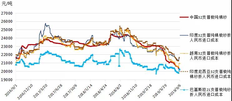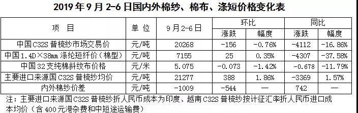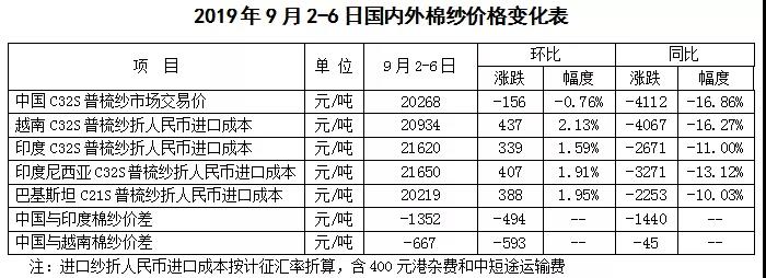 本周,中美貿(mào)易談判重啟,國(guó)內(nèi)棉紗市場(chǎng)氣氛略顯回穩(wěn),但訂單未見明顯好轉(zhuǎn),純棉紗價(jià)格弱穩(wěn)為主;受原料上漲影響,國(guó)際棉紗市場(chǎng)交投情緒略顯好轉(zhuǎn),印度和巴基斯坦棉紗價(jià)格出現(xiàn)上漲跡象,9月計(jì)征匯率調(diào)整后,常規(guī)純棉外紗均價(jià)高于國(guó)產(chǎn)紗價(jià)格1009元/噸;國(guó)內(nèi)純棉布降價(jià)走量,庫存仍處高位;滌綸短纖價(jià)格隨原料PTA走勢(shì)回暖。