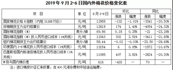 本周,市場(chǎng)受中美貿(mào)易形勢(shì)左右,第13輪中美經(jīng)貿(mào)磋商重啟消息公布后,市場(chǎng)悲觀情緒稍有好轉(zhuǎn),鄭棉期貨價(jià)格上漲,皮棉現(xiàn)貨價(jià)格先跌后漲。2019年9月2-6日,代表內(nèi)地標(biāo)準(zhǔn)級(jí)皮棉銷售價(jià)格的國(guó)家棉花價(jià)格B指數(shù)均價(jià)12958元/噸,較上周下跌132元/噸,跌幅1.01%;鄭州棉花期貨主力合約結(jié)算均價(jià)12618元/噸,較上周上漲174元/噸,漲幅1.4%;儲(chǔ)備棉輪出成交均價(jià)11723/噸,較上周上漲138元/噸,漲幅1.19%。