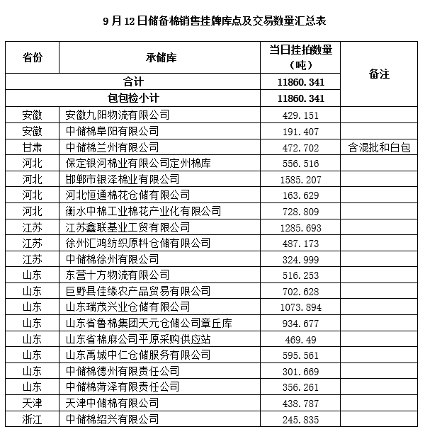 中國(guó)儲(chǔ)備棉管理有限公司定于9月12日上市銷售儲(chǔ)備棉重量11860.341噸,共65捆。