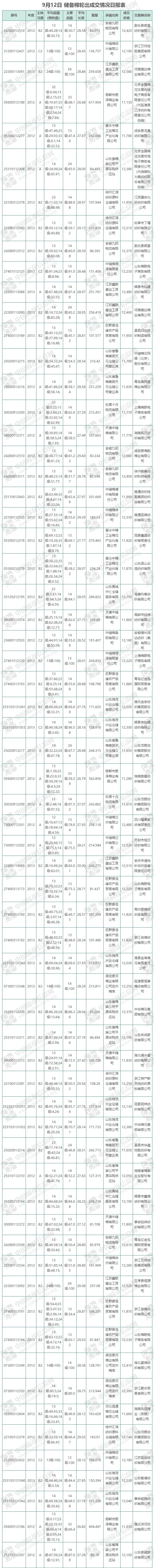 9月12日儲備棉輪出銷售資源11860.341噸,實際成交11860.341噸,成交率100%,成交均價12001元/噸,較11日上漲38元/噸;折3128價格13472元/噸,較11日上漲188元/噸。