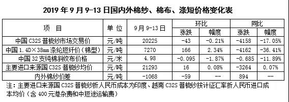 國內(nèi)棉價(jià)謹(jǐn)慎為主。據(jù)國家統(tǒng)計(jì)局?jǐn)?shù)據(jù)顯示,8月份,我國居民消費(fèi)價(jià)格指數(shù)(CPI)和生產(chǎn)價(jià)格指數(shù)(PPI)延續(xù)分化態(tài)勢(shì),CPI同比上漲2.8%,PPI同比下降0.8%,PPI和CPI剪刀差較上月擴(kuò)大0.5個(gè)百分點(diǎn),連續(xù)9個(gè)月為負(fù),反映我國工業(yè)企業(yè)利潤下降態(tài)勢(shì)仍將延續(xù)。國內(nèi)棉花市場(chǎng)方面,新棉零星采摘收購,奎屯個(gè)別企業(yè)手摘棉開秤價(jià)格6.2-6.3元/公斤,南疆巴楚6.1-6.2元/公斤,喀什5.6-5.8元/公斤,吐魯番5.4-5.6元/公斤,內(nèi)地山東、河北等地籽棉收購價(jià)格在2.9-3.05元/斤,部分地區(qū)收購價(jià)格處于下調(diào)狀態(tài),下調(diào)幅度在0.05元/公斤。目前大部分企業(yè)新棉加工、銷售尚未開始,收購價(jià)格尚不具代表性。預(yù)計(jì)9月底至10月初,新棉將大量上市,屆時(shí)新棉收購價(jià)格將會(huì)逐漸明朗。新棉季節(jié)性供應(yīng)來臨壓力下,鄭棉倉單快速流出,截至9月12日,鄭棉倉單44.49萬噸,較9月初流出2.68萬噸。本周儲(chǔ)備棉成交率接近100%,市場(chǎng)供應(yīng)端仍然充裕。下游市場(chǎng)“旺季不旺”,據(jù)國家棉花市場(chǎng)監(jiān)測(cè)系統(tǒng)數(shù)據(jù),9月初,被抽樣調(diào)查企業(yè)紗、布產(chǎn)銷率分別為96.6%、89.9%,同比分別下降1.3個(gè)百分點(diǎn)、11.3個(gè)百分點(diǎn),庫存分別較上年同期增加13.7天、16.7天。中美貿(mào)易摩擦拖累紡織企業(yè)訂單和利潤明顯受損,對(duì)棉紡織服裝產(chǎn)業(yè)產(chǎn)生負(fù)面影響集中在需求領(lǐng)域。短期內(nèi),中美貿(mào)易反復(fù)性和復(fù)雜性,可能導(dǎo)致產(chǎn)成品銷售難度繼續(xù)增加,疊加新花供應(yīng)壓力即將來臨,國內(nèi)棉價(jià)很難擺脫弱勢(shì)局面。近期關(guān)注籽棉購銷雙方價(jià)格博弈和天氣變化。