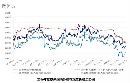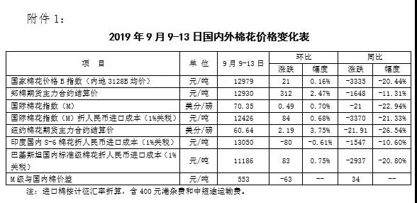 本周,受中國對(duì)新的美國農(nóng)產(chǎn)品采購實(shí)施加征關(guān)稅排除提振,國際棉價(jià)上漲。2019年9月9-13日,紐約棉花期貨主力合約結(jié)算價(jià)60.64美分/磅,較上周上漲2.19美分/磅,漲幅3.75%,代表進(jìn)口棉中國主港到岸均價(jià)的國際棉花指數(shù)(M)為70.35美分/磅,較上周上漲0.49美分/磅,漲幅0.7%,折人民幣進(jìn)口成本12426元/噸,較上周上漲84元/噸,漲幅0.68%;內(nèi)外棉價(jià)差553元/噸,較上周縮小63元/噸。