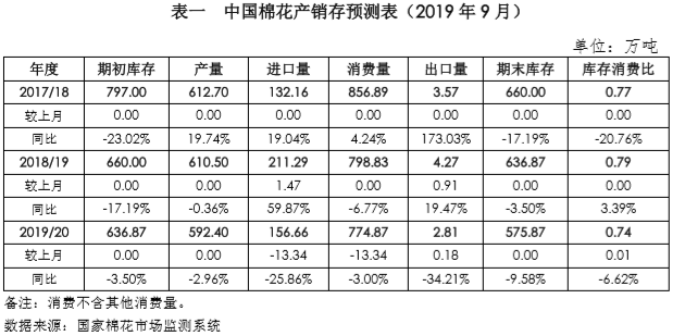 本期月報(bào)將2018/19年度棉花進(jìn)口量調(diào)增1.47萬噸至211.29萬噸,棉花出口量調(diào)增0.91萬噸至4.27萬噸;將2019/20年度棉花進(jìn)口量調(diào)減13.34萬噸至156.66萬噸,棉花消費(fèi)量調(diào)減13.34萬噸至774.87萬噸,出口量調(diào)增0.18萬噸至2.81萬噸。詳見下表。