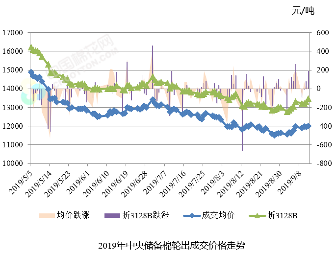 當(dāng)周,中央儲(chǔ)備棉成交均價(jià)11958元/噸,較前周上漲235元/噸;折標(biāo)準(zhǔn)級(jí)(3128B)價(jià)格13294元/噸,較前周上漲302元/噸。其中新疆棉成交均價(jià)12200元/噸,較前周上漲310元/噸,折3128B價(jià)格13630元/噸,較前周上漲330元/噸,平均加價(jià)1173元/噸,較前周上漲208元/噸;地產(chǎn)棉成交均價(jià)11748元/噸,較前周上漲202元/噸,折3128B價(jià)格13002元/噸,較前周上漲337元/噸,平均加價(jià)545元/噸,較前周上漲215元/噸。當(dāng)周,中央儲(chǔ)備棉最高成交價(jià)12680元/噸,最低成交價(jià)11290元/噸。