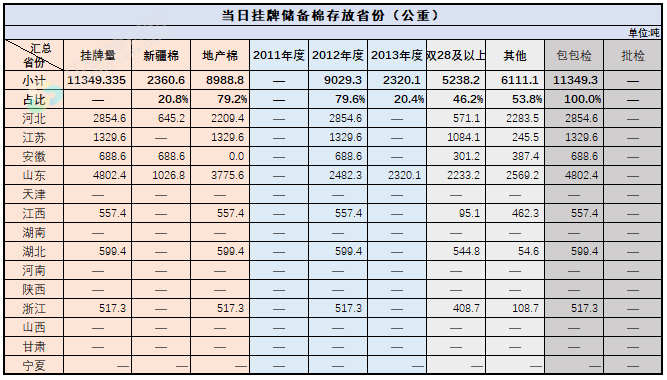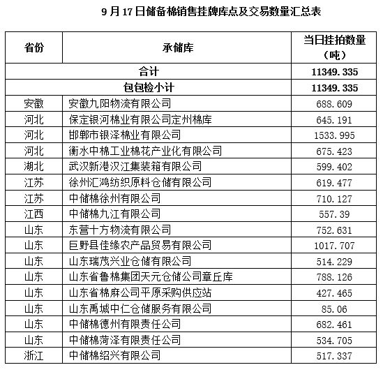 中國(guó)儲(chǔ)備棉管理有限公司定于9月17日上市銷(xiāo)售儲(chǔ)備棉重量11349.335噸,共71捆。
