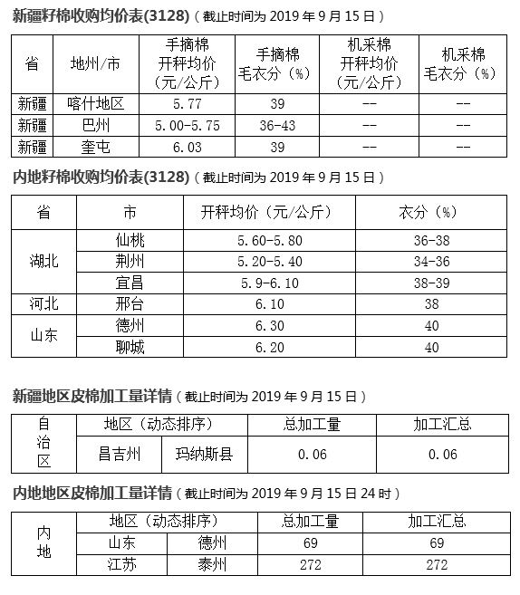 本年度棉花收購開秤時間較晚,開秤價低于往年,開秤率和收購量也較低,截止到9月15日,新疆累計加工量0.06噸、內(nèi)地341噸,其中山東69噸、江蘇272噸。