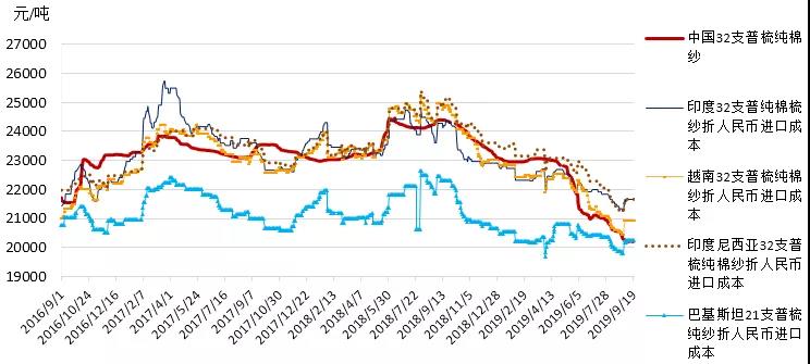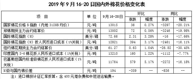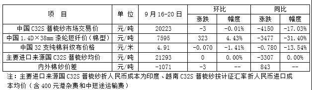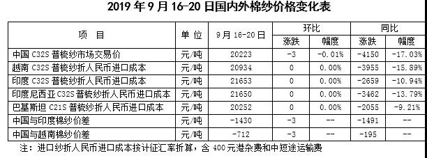 2019年9月16-20日國(guó)內(nèi)外棉紗、棉布、滌短價(jià)格變化表