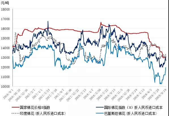 本周,受石油價(jià)格沖高回落影響,國(guó)際棉價(jià)先漲后跌,整體高于上周。2019年9月16-20日紐約棉花期貨主力合約結(jié)算價(jià)61.27美分/磅,較上周上漲0.63美分/磅,漲幅1.04%,代表進(jìn)口棉中國(guó)主港到岸均價(jià)的國(guó)際棉花指數(shù)(M)為72.66美分/磅,較上周上漲2.31美分/磅,漲幅3.28%,折人民幣進(jìn)口成本12821元/噸,較上周上漲394元/噸,漲幅3.17%;內(nèi)外棉價(jià)差194元/噸,較上周縮小359元/噸。
