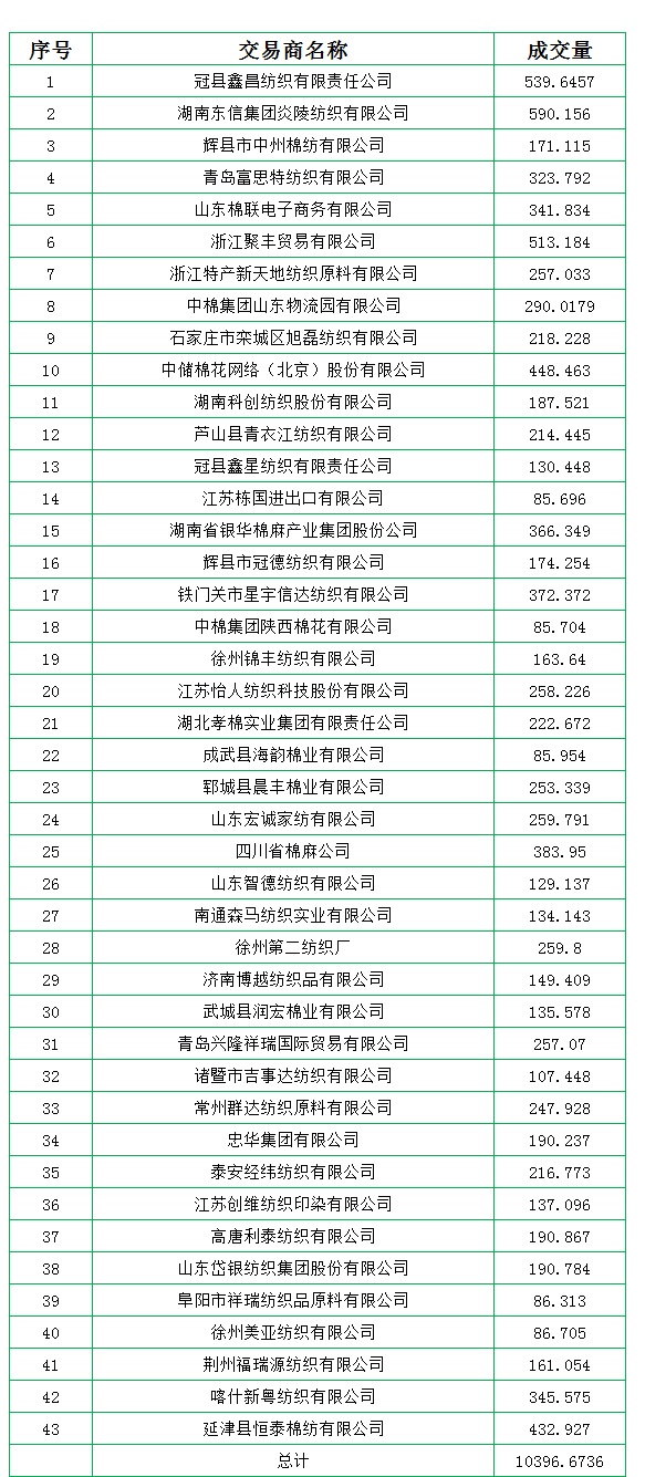 新疆棉成交均價(jià)12281元/噸,新疆棉折3128價(jià)格13279元/噸,新疆棉加價(jià)幅度559元/噸。