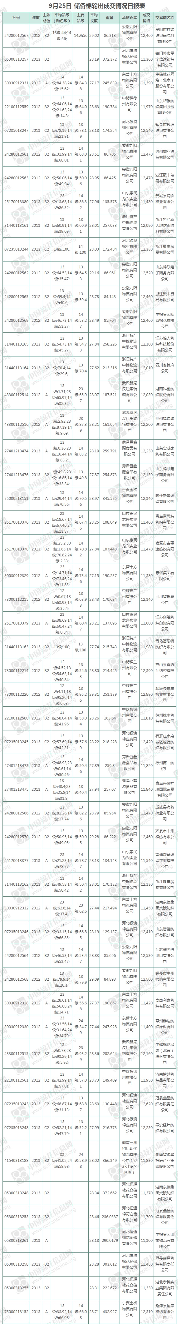 9月25日儲(chǔ)備棉輪出銷(xiāo)售資源11907.4392噸,實(shí)際成交10396.6736噸,成交率87.31%,成交均價(jià)11951元/噸,較24日下跌128元/噸;折3128價(jià)格13142元/噸,較24日下跌108元/噸。