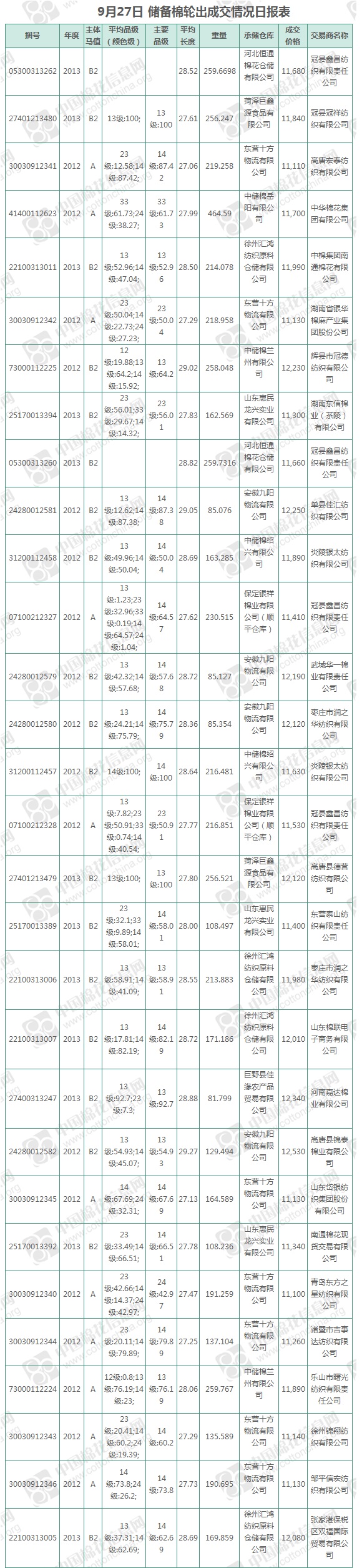 9月27日儲(chǔ)備棉輪出銷售資源10209.3374噸,實(shí)際成交5714.3164噸,成交率55.97%,成交均價(jià)11684元/噸,較26日下跌317元/噸;折3128價(jià)格12929元/噸,較26日下跌257元/噸。