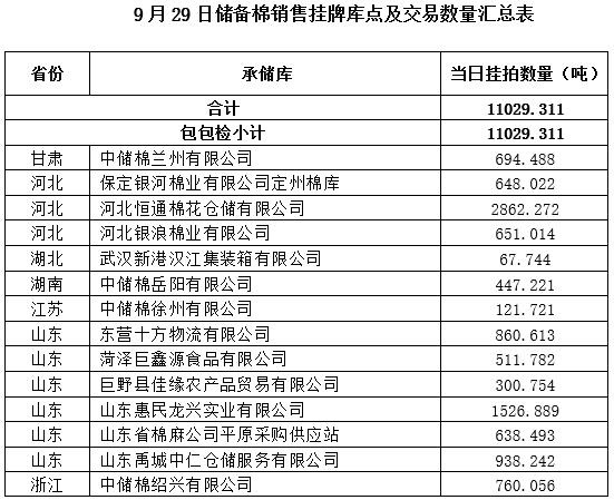 中國(guó)儲(chǔ)備棉管理有限公司定于9月29日上市銷售儲(chǔ)備棉重量11029.311噸,共57捆。