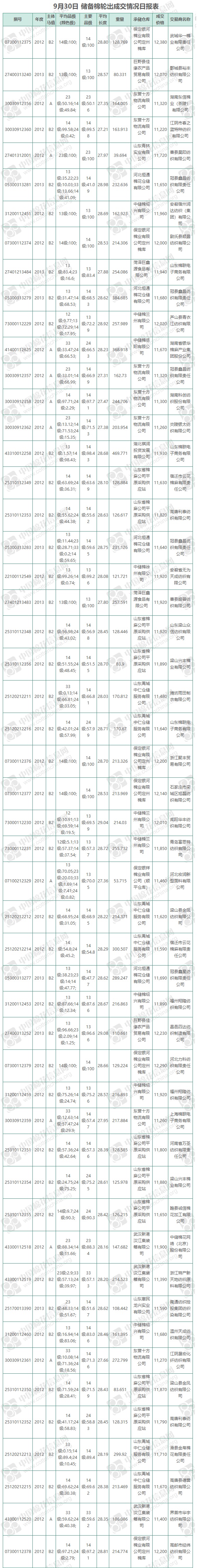 9月30日儲(chǔ)備棉輪出銷(xiāo)售資源12004.956噸,實(shí)際成交10011.419噸,成交率83.39%,成交均價(jià)11743元/噸,較29日上漲15元/噸;折3128價(jià)格13068元/噸,較29日上漲25元/噸。