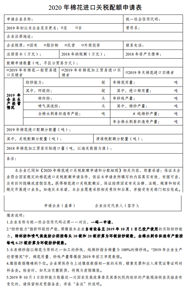 (一)2020年棉花進(jìn)口關(guān)稅配額申請(qǐng)表,電子版可從國(guó)家發(fā)展改革委網(wǎng)站(http://www.ndrc.gov.cn)下載。
