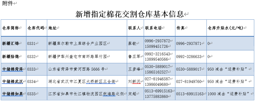 一、增設(shè)新疆匯錦物流有限公司、新疆伊犁州陸德棉麻有限責(zé)任公司、中儲(chǔ)棉武漢有限公司、中儲(chǔ)棉如皋有限公司、中儲(chǔ)棉菏澤有限責(zé)任公司為指定棉花交割倉庫。新疆匯錦物流有限公司的期貨交割棉注銷提貨時(shí),如選擇鐵路出庫,由新疆匯錦物流有限公司承擔(dān)倉庫至庫西站臺(tái)的短駁費(fèi)用。