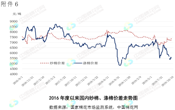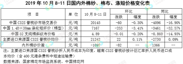 國(guó)內(nèi)棉花市場(chǎng)謹(jǐn)慎為主。據(jù)國(guó)家統(tǒng)計(jì)局?jǐn)?shù)據(jù)顯示,8月規(guī)模以上紡織業(yè)工業(yè)增加值同比增加0.1,%,增速環(huán)比下降1.1個(gè)百分點(diǎn),8月紡織業(yè)出口交貨值同比下降5.8個(gè)百分點(diǎn),自5月以來(lái)連續(xù)4個(gè)月負(fù)增長(zhǎng),中美貿(mào)易摩擦已對(duì)紡織行業(yè)造成沖擊。國(guó)內(nèi)棉花市場(chǎng)方面,據(jù)國(guó)家棉花市場(chǎng)監(jiān)測(cè)系統(tǒng)調(diào)查數(shù)據(jù)顯示,2019/20年度國(guó)內(nèi)棉花總產(chǎn)量預(yù)計(jì)616萬(wàn)噸,同比增長(zhǎng)0.9%。截至2019年10月11日全國(guó)新棉采摘進(jìn)度29.7%,累計(jì)交售籽棉折皮棉114.6萬(wàn)噸,其中新疆103.9萬(wàn)噸,加工率30%。節(jié)后籽棉收購(gòu)價(jià)有所上漲,北疆部分地區(qū)機(jī)采棉收購(gòu)價(jià)較節(jié)前上漲約0.2元/公斤至4.6-4.9元/公斤,棉籽價(jià)格跌0.3-0.4元/公斤至1.65-1.7元/公斤,導(dǎo)致軋花廠成本有所增加。預(yù)計(jì)10月底至11月新棉將大量上市,收購(gòu)價(jià)將逐漸明朗,季節(jié)性供應(yīng)壓力隨即增加。9月以后下游紡織廠因前期高價(jià)原料庫(kù)存有所下降,經(jīng)營(yíng)狀況較前期有所好轉(zhuǎn),但“金九銀十”傳統(tǒng)旺季較往年相差甚遠(yuǎn),純棉紗受損嚴(yán)重,企業(yè)配棉比意愿下降,開(kāi)工率不足。下游坯布需求疲弱,據(jù)國(guó)家棉花市場(chǎng)監(jiān)測(cè)系統(tǒng)數(shù)據(jù)顯示,截至10月初布產(chǎn)銷率89.9%,同比下降8個(gè)百分點(diǎn)。受中美貿(mào)易摩擦影響,整個(gè)棉紡織服裝產(chǎn)業(yè)鏈原料和產(chǎn)成品庫(kù)存壓縮,市場(chǎng)謹(jǐn)慎操作為主。短期國(guó)內(nèi)棉價(jià)隨中美貿(mào)易消息反復(fù)波動(dòng),缺乏真正回暖動(dòng)力。