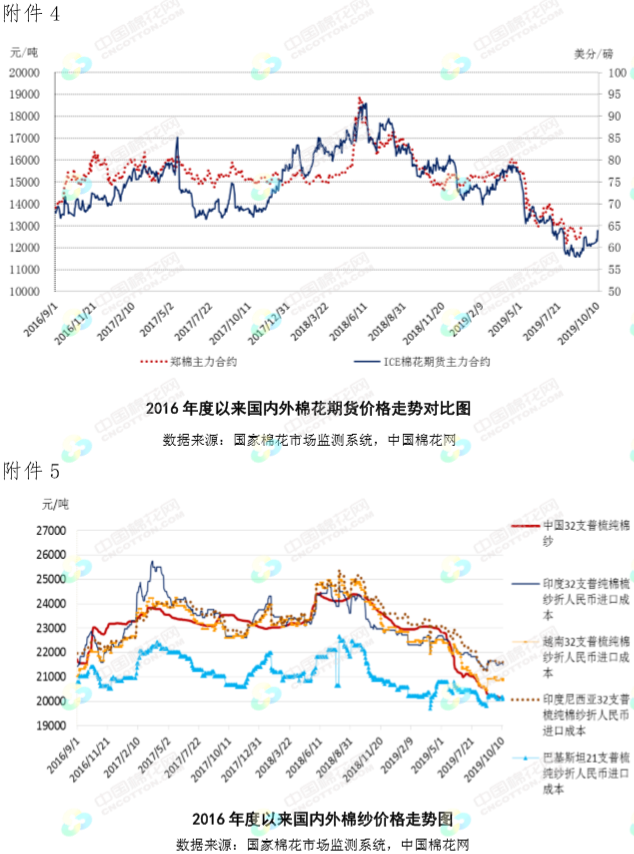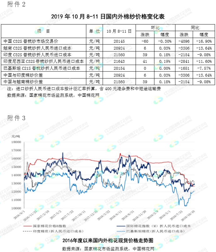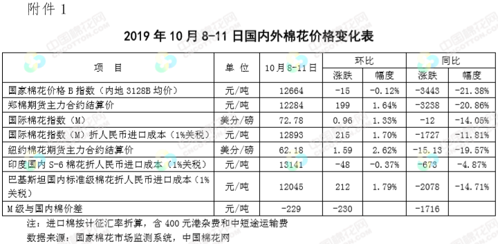 本周,受助于中美貿(mào)易談判憧憬,國(guó)際棉價(jià)上漲。2019年10月8-11日,紐約棉花期貨主力合約結(jié)算價(jià)62.18美分/磅,較上周上漲1.59美分/磅,漲幅2.62%,代表進(jìn)口棉中國(guó)主港到岸均價(jià)的國(guó)際棉花指數(shù)(M)72.78美分/磅,較上周上漲0.96美分/磅,漲幅1.33%,折人民幣進(jìn)口成本12893元/噸,較上周上漲215元/噸,漲幅1.70%;國(guó)際棉價(jià)高于國(guó)內(nèi)棉價(jià)229元/噸,與上周形成反差。
