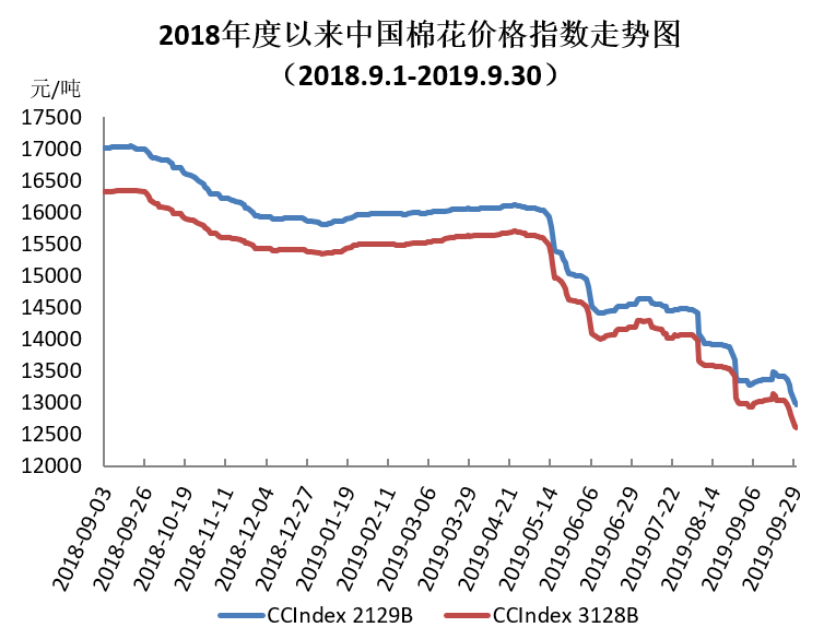 9月中美雙方商定進(jìn)行新一輪高級(jí)別磋商,行業(yè)信心有所恢復(fù)。國(guó)內(nèi)庫(kù)存依然較大,市場(chǎng)資源供應(yīng)充裕。紡織企業(yè)需求較前幾月相對(duì)好轉(zhuǎn),棉花現(xiàn)貨價(jià)格雖下跌但幅度趨小。月末中國(guó)棉花價(jià)格指數(shù)(CCIndex3128B)12608元/噸,較上月末下跌377元,跌幅環(huán)比縮小705元;月均價(jià)12962元/噸,環(huán)比下跌572元,同比下跌3351元。