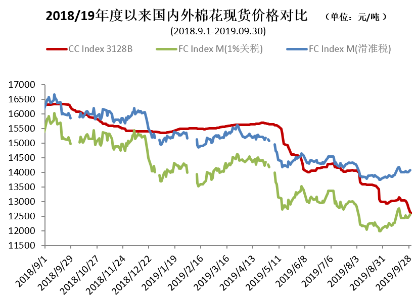 9月中下旬內(nèi)地及新疆棉產(chǎn)區(qū)新棉陸續(xù)開秤收購(gòu)并零星上市,國(guó)內(nèi)棉花企業(yè)積極銷售陳棉庫(kù)存。中美貿(mào)易摩擦出現(xiàn)緩和,市場(chǎng)預(yù)期有所好轉(zhuǎn)。同時(shí)紡織行業(yè)進(jìn)入傳統(tǒng)旺季,企業(yè)需求相對(duì)好轉(zhuǎn),國(guó)內(nèi)棉花價(jià)格雖延續(xù)下跌,但跌幅趨小。國(guó)際棉花市場(chǎng)止跌企穩(wěn),月末內(nèi)外棉現(xiàn)貨價(jià)格趨于一致。