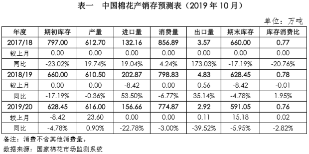 本期月報(bào)將2018/19年度棉花進(jìn)口量調(diào)減8.42萬(wàn)噸至202.87萬(wàn)噸,出口量調(diào)增0.56萬(wàn)噸至4.83萬(wàn)噸,期末庫(kù)存調(diào)減8.42萬(wàn)噸至628.45萬(wàn)噸;將2019/20年度棉花產(chǎn)量調(diào)增23.6萬(wàn)噸至616萬(wàn)噸;出口量調(diào)增0.11萬(wàn)噸至2.92萬(wàn)噸,期末庫(kù)存調(diào)增15.18萬(wàn)噸至591.05萬(wàn)噸。詳見(jiàn)下表。