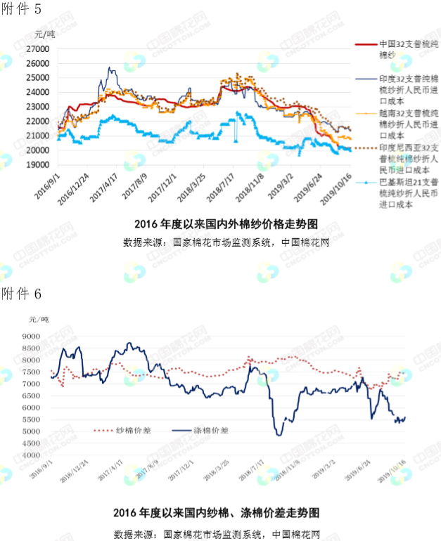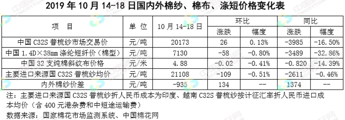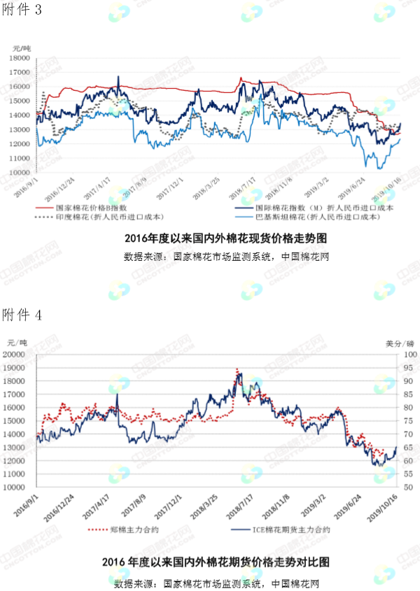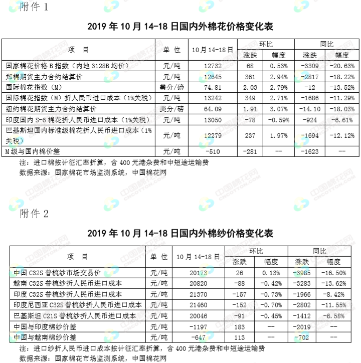 本周,受美元指數(shù)下跌和中國將增加自美國農(nóng)產(chǎn)品訂購消息提振,國際棉價(jià)繼續(xù)上漲。2019年10月14-18日,紐約棉花期貨主力合約結(jié)算價(jià)64.09美分/磅,較上周上漲1.91美分/磅,漲幅3.07%,代表進(jìn)口棉中國主港到岸均價(jià)的國際棉花指數(shù)(M)74.81美分/磅,較上周上漲2.03美分/磅,漲幅2.79%,折人民幣進(jìn)口成本13242元/噸,較上周上漲349元/噸,漲幅2.71%;國際棉價(jià)高于國內(nèi)棉價(jià)510元/噸,價(jià)差較上周縮小281元/噸。