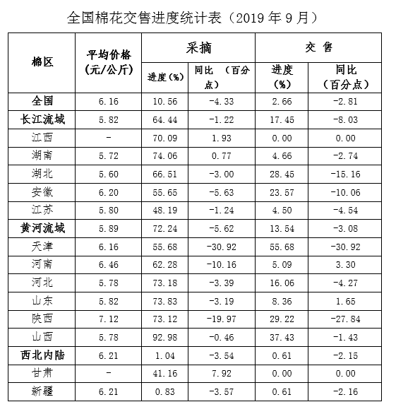 2019年9月,中國棉花協(xié)會(huì)棉農(nóng)分會(huì)對內(nèi)地12個(gè)省市和新疆自治區(qū)共2390個(gè)定點(diǎn)農(nóng)戶,進(jìn)行棉花采摘與交售進(jìn)度及產(chǎn)量預(yù)測的調(diào)查,調(diào)查結(jié)果顯示:新疆受前期不利天氣影響,棉花發(fā)育遲緩,采摘、交售進(jìn)度慢于去年;內(nèi)地天氣適宜棉花裂鈴?fù)滦酢⒉烧傲罆?,但因棉花價(jià)格偏低,勞動(dòng)力較少,采摘及交售的積極性不高,進(jìn)度均慢于去年同期。截止到9月底,全國采摘進(jìn)度10.56%,同比下降4.33百分點(diǎn);交售進(jìn)度2.66%,同比下降2.81百分點(diǎn);平均交售價(jià)格6.16元/公斤,同比下降13.45%。