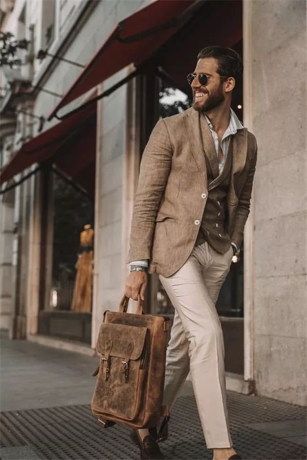 大地色系亞麻男士西裝,視覺簡單自然,百搭好駕馭,簡單的色調,蘊含深刻難忘的品味質感。