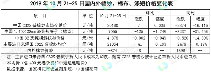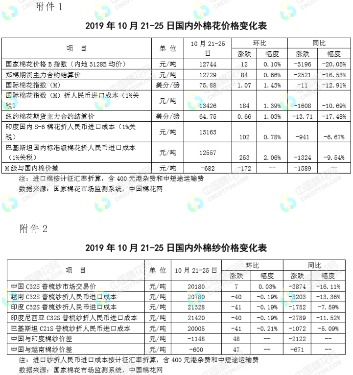 本周,受新疆棉花減產(chǎn)消息持續(xù)及國際棉價上漲帶動,國內(nèi)棉價小幅上漲。2019年10月21-25日,代表內(nèi)地標(biāo)準(zhǔn)級皮棉銷售價格的國家棉花價格B指數(shù)均價12744元/噸,較上周上漲12元/噸,漲幅0.1%;鄭州棉花期貨主力合約結(jié)算均價12729元/噸,較上周上漲84元/噸,漲幅0.66%。