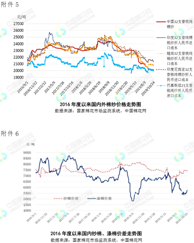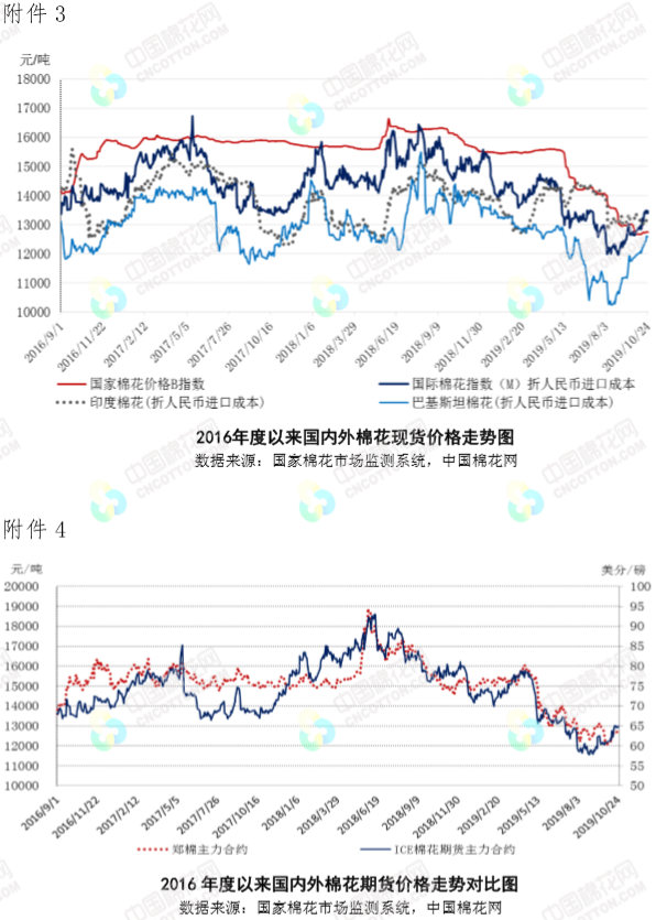 本周,國際貿(mào)易局勢樂觀預(yù)期持續(xù)升溫,推動國際棉價繼續(xù)上漲。2019年10月21-25日,紐約棉花期貨主力合約結(jié)算價64.75美分/磅,較上周上漲0.66美分/磅,漲幅1.03%,代表進(jìn)口棉中國主港到岸均價的國際棉花指數(shù)(M)75.88美分/磅,較上周上漲1.07美分/磅,漲幅1.43%,折人民幣進(jìn)口成本13426元/噸,較上周上漲184元/噸,漲幅1.36%;國際棉價高于國內(nèi)棉價682元/噸,價差較上周擴(kuò)大172元/噸。