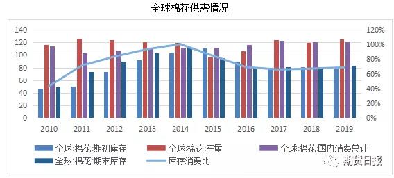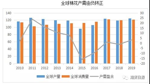 據(jù)最新美農(nóng)報告是,2019/20年度美棉產(chǎn)量預估同比大增334萬包,消費量預估與上年度相當;本年度印度棉花也因天氣改善單產(chǎn)提高,產(chǎn)量預估同比增加400萬包,末庫存量預估同比大增335萬包;中國暫時維持本年度產(chǎn)量和消費量預估較上個年度不變。因美國和印度棉花產(chǎn)量同比大增幅度大于其他國家棉花產(chǎn)量下降幅度,全球棉花產(chǎn)量預估同比增加576萬包,而消費量僅增加138萬包,期末庫存量預估增加296萬包至8369萬包。與上一年度相比,本年度棉花產(chǎn)需由負轉(zhuǎn)正,盈余316萬包,為近5個年度以來最高盈余。