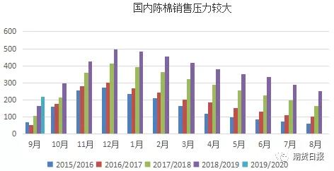 據(jù)中國棉花協(xié)會顯示,今年新棉產(chǎn)量586.7萬噸,同比下降10.7萬噸。而市場內(nèi)自由流通的陳棉同比大幅增加。據(jù)中國棉花協(xié)會調(diào)查,9月底全國棉花商業(yè)庫存總量約220.35萬噸,較上月減少31.74萬噸,同比仍高53.76萬噸。同時新棉銷售率亦不佳。截至2019年10月25日全國銷售率4.7%,同比下降0.5個百分點,較過去4年均值降低4.9個百分點,其中新疆銷售4.3%。