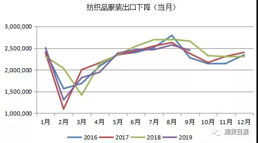 出口方面,環(huán)比、同比均表現(xiàn)為下降。據(jù)海關(guān)統(tǒng)計,2019年9月我國出口紡織品服裝245.2億美元,環(huán)比降4.6%,同比降7.9%。其中出口紡織紗線、織物及制品100.1億美元,同比下降7.9%;出口服裝及衣著附件147.6億美元,同比下降7.9%。今年1-9月我國出口紡織品服裝2019.5億美元,同比下降2.8%,較近5年同期均值下降0.8%。其中出口紡織紗線、織物及制品891.6億美元,同比下降0.1%;出口服裝及衣著附件980.4億美元,同比下降4.8%。