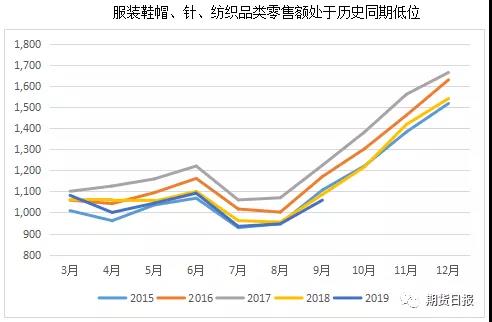 9月國內(nèi)服裝鞋帽、針、紡織品類零售額1058億元,環(huán)比增加11.88%,同比下降2.49%,為近5年來同期最低銷售水平。今年以來國內(nèi)服裝鞋帽、針、紡織品類零售額一直處于近5年同期最低位。今年1-9月國內(nèi)服裝鞋帽、針、紡織品類零售總額9479億元,同比下降102億元,較近5年均值下降317億元。