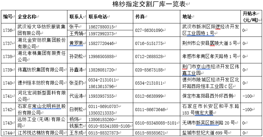 增設(shè)以下企業(yè)為棉紗指定交割廠庫:武漢裕大華紡織服裝集團有限公司、湖北金安紡織集團股份有限公司、湖北孝棉集團有限責(zé)任公司、偉嘉紡織集團有限公司、德州恒豐紡織有限公司、河北宏潤新型面料有限公司、石家莊常山北明科技股份有限公司、遠紡工業(yè)(無錫)有限公司、江蘇悅達棉紡有限公司。