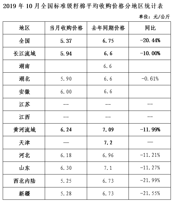 據(jù)統(tǒng)計,截止到10月31日,全國400型棉花加工企業(yè)3128級籽棉平均收購價5.37元/公斤,同比下降20.44%。新疆籽棉收購價5.28元/公斤,同比下降21.55%;長江流域籽棉收購價5.94元/公斤,同比下降10.00%;黃河流域收購價6.24元/公斤,同比下降11.99%。