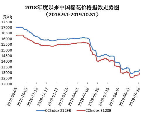 10月中美談判進(jìn)展順利貿(mào)易摩擦趨緩,有利于經(jīng)濟預(yù)期穩(wěn)定,對市場信心有明顯提振。隨著新棉大量上市,國內(nèi)庫存量依然較大,市場資源供應(yīng)充裕。紡企需求進(jìn)一步好轉(zhuǎn),棉花現(xiàn)貨價格平穩(wěn)上漲。月末中國棉花價格指數(shù)(CCIndex3128B)12971元/噸,較上月末上漲363元;月均價12962元/噸,環(huán)比下跌239元,同比下跌3237元。