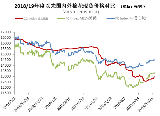 10月中美貿(mào)易摩擦趨緩,月底美聯(lián)儲年內(nèi)三度降息,國際棉花期現(xiàn)貨價格震蕩上漲,下旬外棉現(xiàn)貨價格反超國內(nèi)棉價,價差逐漸加大。中國進(jìn)口棉價格指數(shù)FCIndexM月均75.27美分/磅,環(huán)比漲4.02美分/磅。月末77美分/磅,高于上月末4.69美分/磅,1%關(guān)稅下折人民幣13418元/噸,高于同期國內(nèi)現(xiàn)貨447元/噸,較前上月末反向擴大494元/噸。