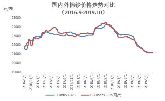 本月內(nèi)外棉紗價格繼續(xù)下跌。據(jù)調(diào)查,國產(chǎn)32支純棉紗9月均價21112元/噸,較上月下降35元/噸,跌幅0.17%,較去年同期下跌3053元/噸,跌幅12.6%;進(jìn)口32支純棉紗月均價21192元/噸,較上月下跌27元/噸,跌幅0.13%,較去年同期下跌2819元/噸,跌幅11.7%。
