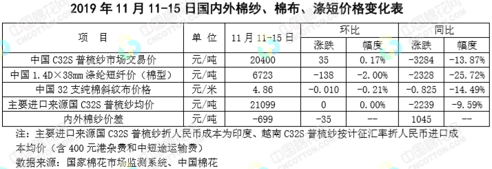 本周,受中美達(dá)成貿(mào)易協(xié)議希望重燃及美棉出口良好提振,國際棉價小幅上漲。2019年11月11-15日紐約棉花期貨主力合約結(jié)算價66.28美分/磅,較上周上漲0.56美分/磅,漲幅0.79%,代表進(jìn)口棉中國主港到岸均價的國際棉花指數(shù)(M)76.77美分/磅,較上周上漲0.6美分/磅,漲幅0.79%,折人民幣進(jìn)口成本13582元/噸,較上周上漲103元/噸,漲幅0.76%;國際棉價高于國內(nèi)棉價650元/噸,價差較上周擴(kuò)大73元/噸。