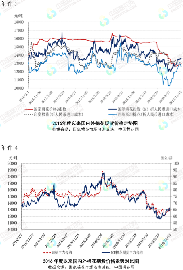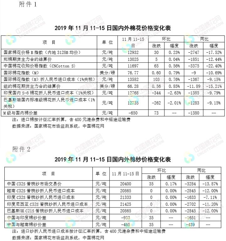 本周,輪入50萬噸新疆棉公告發(fā)布,國內(nèi)棉價小幅上漲。2019年11月11-15日代表內(nèi)地標(biāo)準(zhǔn)級皮棉銷售價格的國家棉花價格B指數(shù)均價12932元/噸,較上周上漲30元/噸,漲幅0.23%;鄭州棉花期貨主力合約結(jié)算均價13025元/噸,較上周上漲5元/噸,漲幅0.04%;代表全國主產(chǎn)棉省(區(qū))白棉3級籽棉折皮棉均價的中國棉花收購價格S指數(shù)11697元/噸,較上周上漲65元/噸,漲幅0.56%。
