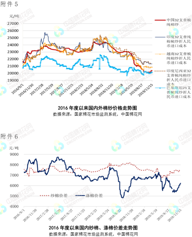 國際棉花市場謹(jǐn)慎盤整尋找方向。美國10月零售銷售數(shù)據(jù)好壞參半,核心零售銷售不及預(yù)期,值得注意的是,美國消費(fèi)者減少對大件商品及服裝的購買,經(jīng)濟(jì)增長緩慢和貿(mào)易局勢可能會降低市場對假期消費(fèi)預(yù)期。國際棉花市場方面,美國產(chǎn)棉區(qū)天氣正在轉(zhuǎn)好,北半球產(chǎn)棉國迎來新棉采收旺季,截至11月10日美棉收獲完成62%,遠(yuǎn)高于去年同期的53%,美國農(nóng)業(yè)部預(yù)計(jì)2019年度美棉產(chǎn)量453.2萬噸,同比增13.3%。消息稱,目前印度棉花公司僅采購少量新棉,幾乎對市場沒有影響,且最低收購的棉花回潮率不能超過12%,高于9%也會折價,這使MSP收購對市場支持力度明顯減弱,導(dǎo)致新棉現(xiàn)貨價格遠(yuǎn)低于市場預(yù)期。截至10月13日印度棉花上市量24萬噸,上市進(jìn)度4%,上年同期為8%,印度棉花協(xié)會預(yù)計(jì)2019年印度棉花產(chǎn)量603萬噸,同比增加13%。國際棉花咨詢委員會(ICAC)預(yù)計(jì)2019年度全球產(chǎn)量2670萬噸,同比增加101萬噸,消費(fèi)量2620萬噸,同比僅增7萬噸,全球供求關(guān)系有望達(dá)到寬松。本周國際皮棉現(xiàn)貨市場需求減弱,國際棉紗市場交投依舊清淡。目前市場對全球貿(mào)易前景的變化非常敏感,任何關(guān)于全球貿(mào)易前景消息都可能會給市場短線走勢帶來波動,在中美雙方尚未敲定協(xié)議前,國際市場可能謹(jǐn)慎振蕩尋求方向?yàn)橹鳌?/p>