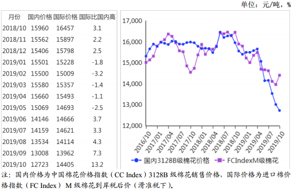 (一)國內(nèi)棉價環(huán)比小幅下跌。本月國儲棉輪出結(jié)束,低價棉供給減少,為棉價提供一定支撐。但新棉集中上市,陳棉庫存偏高,棉價上漲乏力。10月國內(nèi)3128B級棉花月均價每噸12723元,環(huán)比跌2.2%,同比跌20.3%。鄭棉期貨主力合約CF001月結(jié)算價每噸13130元,環(huán)比漲8.6%,同比跌11.7%。