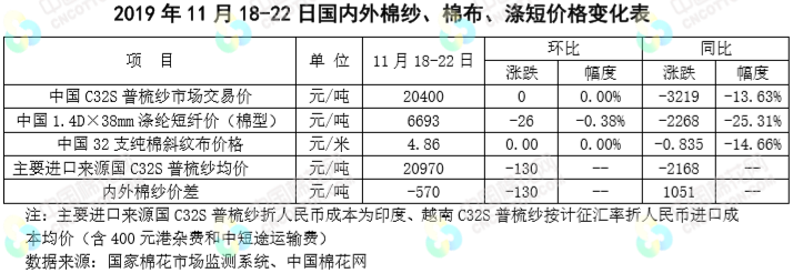 本周,受累于中美貿(mào)易疑慮,國際棉價下跌。2019年11月18-22日紐約棉花期貨主力合約結(jié)算價64.89美分/磅,較上周下跌1.39美分/磅,跌幅2.09%,代表進(jìn)口棉中國主港到岸均價的國際棉花指數(shù)(M)75.83美分/磅,較上周跌幅0.94美分/磅,跌幅1.23%,折人民幣進(jìn)口成本13420元/噸,較上周下跌162元/噸,跌幅1.19%;國際棉價高于國內(nèi)棉價414元/噸,價差較上周縮小195元/噸。